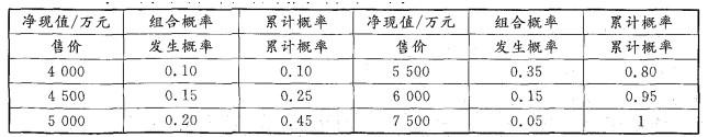 (2)要满足开发商投资回报率的要求,住宅的售价应高于5 200元/平方米,由上述数据可知住宅的售价低于 5 200 元/平方米的概率=0.45 + 0.35×(5 200 — 5 000)/(5 500 — 5 000) =0. 59; 则住宅售价高于5 200元/平方米的概率=1 — 0. 59 = 0. 41,即本项目满足开发商投资回报率妾求的概率为41%,说明项目具有很大风险。