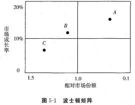 某公司有A、B、C三项业务,分别提供不同的产品和服务为寻求企业资源的最佳组合,该公司采用波士顿矩阵对上述三项业务进行了分析,结果如图5-1所示。