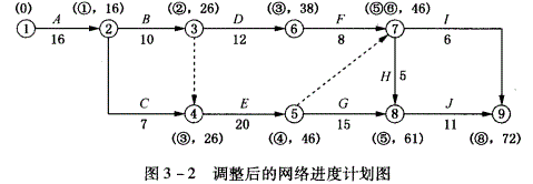 (1)取消K工作后,调整后的网络计划图如图3-2所示。 (2)调整后的关键路线为:A→B→E→G→J; 总工期=16+ 10 +20+ 15 +11 =72(天)。