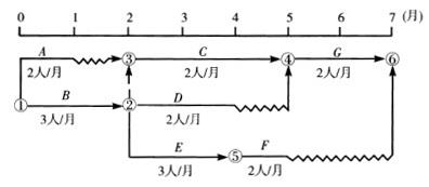 本大题第2问主要考查进度计划的调整及工期的计算。由于乙咨询单位业务繁忙,每月最多能为该项目安排5名咨询人员平行工作,初始进度,计划关键路线为①→②→③→④→⑥、计算总工期为7个月,在第3个月和第4个月的C、D、E工作会出现超过5名咨询人员平行工作的问题,由咨询项目初始进度计划图可知,路线①→②→⑤→⑥有两个月的自由时差,如果使E工作从第4个月月末开始正好能满足人员平行作业要求。