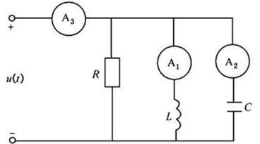 <p>交流电路如图所示,已知u(t)=311sinωtV,R=22Ω,电流表示A1、A2的读数均为10 A,表A3的读数最接近