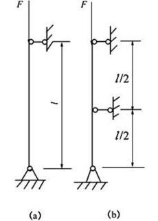 <p>如图所示,两细长压杆除图(b)所示压杆在跨中点增加一个活动铰链外,其他条件均相同,则图(b)压杆的临界力是图(a)压杆的(