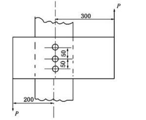 如图所示结构由三个横截面积为A的铆钉连接两块钢板而成,图中尺寸均为mm,则铆钉的最大剪应力为( )。