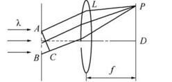 <p>一束波长为λ的平行单色光垂直入射到一单缝AB上,装置如图所示,在屏幕D上形成衍射图样,如果P是中央亮纹一侧第一个暗纹所在的