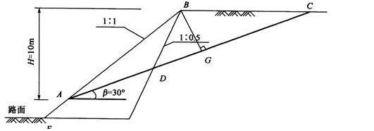 图示路堑岩石边坡坡顶BC水平,已测得滑面AC的倾角β=30°,滑面内摩擦角φ=18°,黏聚力c=10kPa,滑体岩石重度γ=22kN/m3。原设计开挖坡面BE的坡率为1:1,滑面露出点A距坡顶H=10m。为了增加公路路面宽度,将坡率改为1:0.5。试问坡率改变后边坡沿滑面DC的抗滑安全系数K2与原设计沿滑面AC的抗滑安全系数K1之间的正确关系是下列哪个选项?( )