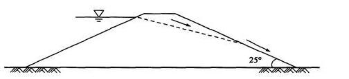 如图所示某山区拟建一座尾矿堆积坝,堆积坝采用尾矿细砂分层压实而成,尾矿的内摩擦角为36°,设计坝体下游坡面坡度α=25°。随着库内水位逐渐上升,坝下游坡面下部会有水顺坡渗出,尾矿细砂的饱和重度为22kN/m3,水下内摩擦角33°。试问坝体下游坡面渗水前后的稳定系数最接近下列哪个选项?( )
