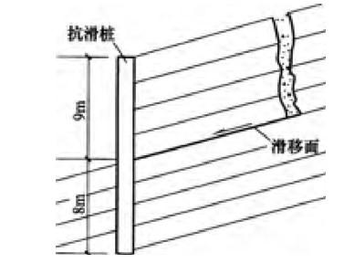 如图所示的顺层岩质边坡,已知每延米滑体作用在桩上的剩余下滑力为900kN,桩间距为6m,悬臂段长9m,锚固段8m,剩余下滑力在桩上的分布按矩形分布,试问抗滑桩锚固段顶端截间上的弯矩是下列哪个选项?