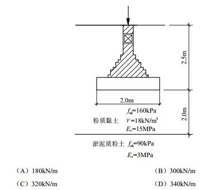 某老建筑物采用条形基础,宽度2.0m,埋深2.5m,拟增层改造,探明基底以下2.0m深处下卧淤泥质粉土,fak=90kPa,Es=3MPa。如图所示,已知上层土的重度为18kN/m3,基础及其上土的平均重度为20kN/m3。地基承载力特征值fak=160kPa,无地下水,试问,基础顶面所允许的最大竖向力Fk与下列何项数值最为接近?