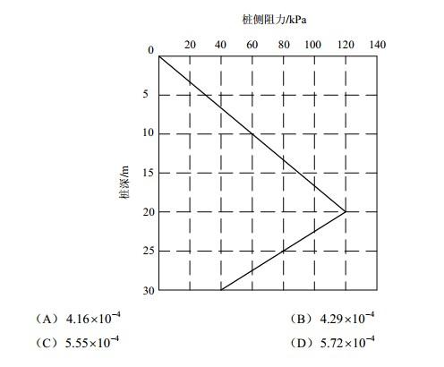 某PHC管桩,桩径500mm,壁厚125mm,桩长30m,桩身混凝土弹性模量为36X106kPa(视为常量),桩底用钢板封口,对其进行单桩静载试验并进行桩身内力测试。根据实测资料,在极限荷载作用下,桩端阻力为1835kPa,桩侧阻力如下图所示。试问该PHC管桩在极限荷载条件下,桩顶面下10m处的桩身应变最接近于下列何项数值?