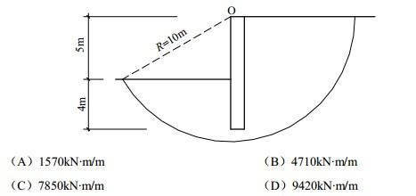 —个在饱和软黏土中的重力式水泥土挡土墙如图所示,土的不排水抗剪强度cu=30kPa,基坑深度5m,墙的埋深4m,滑动圆心在墙顶内侧O点,滑动圆弧半径R=10m。沿着图示的圆弧滑动面滑动,试问每米宽度上的整体稳定抗滑力矩最接近于下列何项数值?