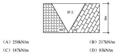 图示重力式挡土墙和墙后岩石陡坡之间填砂土,墙高6m,墙背倾角60°,岩石陡坡倾角60°,砂土γ=17kN/m3,φ=30°;砂土与墙背及岩坡间的摩擦角均为15°,试问该挡土墙上的主动土压力合力Ea与下列何项数值最为接近?