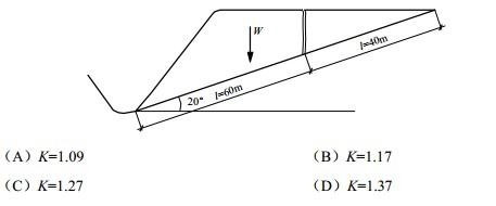 岩质边坡由泥质粉砂岩与泥岩互层组成为不透水边坡,边坡后部有一充满水的竖直拉裂带(如图)。静水压力Pw为1125kN/m,可能滑动的层面上部岩体重量W为22000kN/m,层面摩擦角φ为22°,黏聚力c为20kPa,试问其安全系数最接近于下列何项数值?