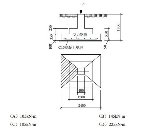 如图示(图中单位为mm),某建筑采用柱下独立方形基础,基础底面尺寸为2.4mX2.4m,柱截面尺寸为0.4mX0.4m。基础顶面中心处作用的柱轴竖向力为F=700kN,力矩M=0,根据《建筑地基基础设计规范》(GB50007-2002),试问基础的柱边截面处的弯矩设计值最接近于下列何项数值?