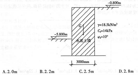 某基坑位于均匀软弱粘性土场地。土层主要参数γ=18.5kN/m3,固结不排水强度指标ck=14kPa,φk=10o。基坑开挖深度为5.0m。拟采用水泥土墙支护,水泥土重度为20.0kN/m3,挡墙宽度为3.0m。根据《建筑基坑支护技术规程》(JGJ120-99)计算水泥土墙嵌固深度设计值,该值最近下列哪个选项的数值?