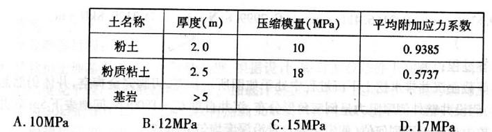 天然地基上的独立基础,基础平面尺寸5mx5m,基底附加压力180kPa,基础下地基土的性质和平均附加应力系数见下表,问地基压缩层的压缩模量当量值最接近下列哪个选项的数值?