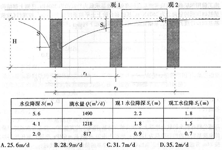 为求取有关水文地质参数,带两个观察孔的潜水完整井,进行3次降深抽水试验,其地层和井壁结构如图所示,已知H=15.8m;r1=10.6m;r2=20.5m;抽水试验成果见下表,问渗透系数k最接近如下选项?
