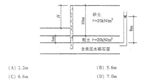 一个采用地下连续墙支护的基坑的土层分布情况如图所示:砂土与粘土的天然重度都是20kN/m3。砂层厚10m,粘土隔水层厚1m,在粘土隔水层以下砾石层中有承压水,承压水头8m。没有采用降水措施,为了保证抗突涌的渗透稳定安全系数不小于1.1,该基坑的最大开挖深度H不能超过下列哪一选项?
