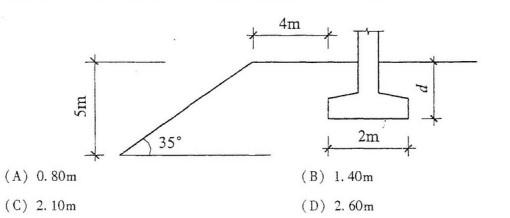 某天然稳定土坡,坡角35o,坡高5m,坡体土质均匀,无地下水,土层的孔隙比e和液性指数IL均小于0.85,γ=20kN/m3、fak=160kPa,坡顶部位拟建工业厂房,采用条形基础,上部结构传至基础顶面的竖向力(Fk)为350kN/m,基础宽度2m。按照厂区整体规划,基础底面边缘距离坡顶为4m。条形基础的埋深至少应达到以下哪个选项的埋深值才能满足要求?(基础结构及其上土的平均重度按20kN/m3考虑)