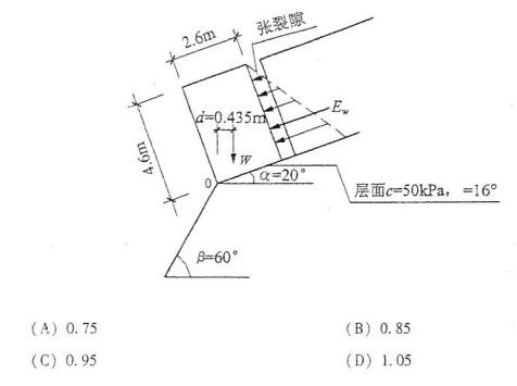 陡坡上岩体被一组平行坡面、垂直层面的张裂缝切割长方形岩块(见示意图)。岩块的重度γ=25kN/m3。问在暴雨水充满裂缝时,靠近坡面的岩块最小稳定系数(包括抗滑动和抗倾覆两种情况的稳定系数取其小值)最接近下列哪个选项?(不考虑岩块两侧阻力和层面水压力)