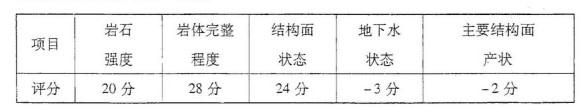 某电站引水隧洞,围岩为流纹斑岩,其各项评分见下表、实测岩体纵波波速平均值为3320m/s,岩块的波速为4176m/s。岩石的饱和单轴抗压强度Rb=55.8MPa,围岩最大主应力σm=11.5MPa,试按《水利水电工程地质勘察规范》(GB502S7-99)的要求进行的围岩分类是下列哪一选项?