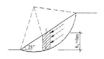倾角为28°的土坡,由于降雨,土坡中地下水发生平行于坡面方向的渗流,利用圆孤条分法进行稳定分析时,其中第i条高度为6m,作用在该条底面上的孔隙水压力最接近于下列哪个数值。
