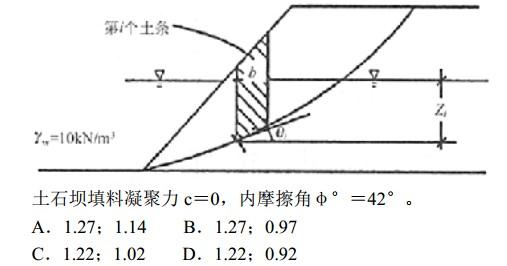 某土石坝坝址区设计烈度为8度,土石坝设计高度30m,根据下面的计算简图,采用瑞典圆弧法计算上游坝坡的抗震稳定性,其中第i个滑动条块的宽度b=3.2m,该条块底面中点的切线与水平线夹角θi=19.3°,该条块内水位高出底面中点的距离Z=6m,条块底面中点孔隙水压力值u=100kPa,考虑地震作用影响后,第i个滑动条块沿底面的下滑力Si=415kN/m。当不计入孔隙水压力影响时,该土条底面的平均有效法向作用力为583kN/m,根据以上条件按照不考虑和考虑孔隙水压力影响两种工况条件分别计算得出第i个滑动条块的安全系数Ki(=Ri/Si)最接近下列哪一选项?()