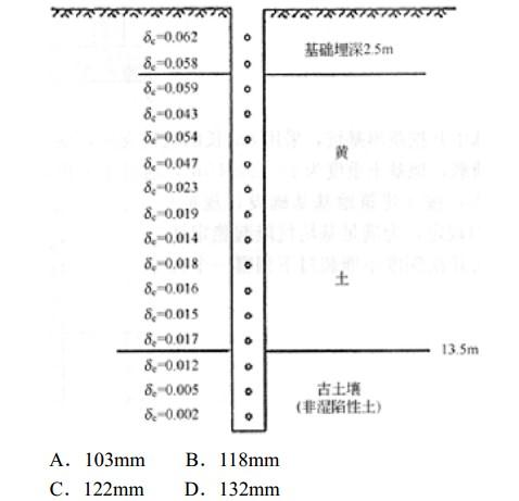 关中地区某自重湿陷性黄土场地的探井资料如下图,从地面下1.0m开始取样,取样间距均为1.0m,假设地面标高与建筑物±0标高相同,基础埋深为2.5m,当基底下地基处理厚度为4.0m时,下部未处理湿陷性黄土层的剩余湿陷量最接近下列选项中的哪一个值?()