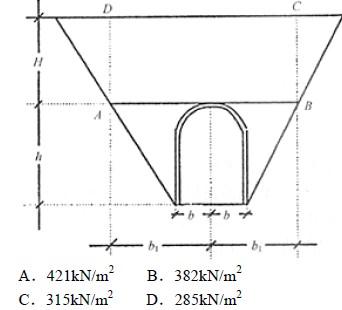 浅埋洞室半跨b=3.0m,高h=8m,上覆松散体厚度H=20m,表观密度Y=18kN/m3,黏聚力c=0,内摩擦角Φ=20°,用太沙基理论求AB面上的均布压力最接近于下列哪个选项中的值?()