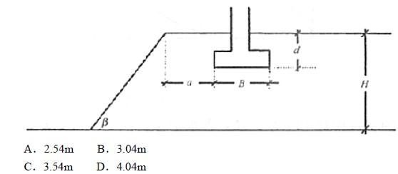 某稳定边坡坡角为30°,坡高H为7.8m,条形基础长度方向与坡顶边缘线平行,基础宽度B为2.4m。若基础底面外缘线距坡顶的水平距离a为4.0m时,基础埋置深度d最浅不能小于下列哪个数值?()