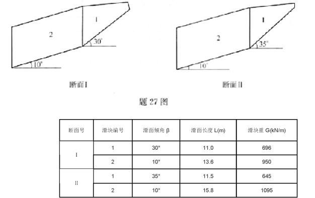 根据勘察资料,某滑坡体正好处于极限平衡状态,稳定系数为1.0,其两组具有代表性的断面数据如下: 试用反分析法求得滑动面的黏聚力c和内摩擦角甲最接近下列()组数值。(计算方法采用下滑力和抗滑力水平分力平衡法)