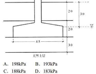 某积水低洼场地进行地面排水后在天然土层上回填厚度5.0m的压实粉土,以此时的回填面标高为准下挖2.0m,利用压实粉土作为独立方形基础的持力层,方形基础边长4.5m,在完成基础及地上结构施工后,在室外地面上再回填2.0m厚的压实粉土,达到室外设计地坪标高,回填材料为粉土,载荷试验得到压实粉土的承载力特征值为150kPa,其他参数见图,若基础施工完成时地下水位已恢复到室外设计地坪下3.0m,(如图所示)地下水位上、下土的重度分别为18.5kN/m3和20.5kN/m3,请按《建筑地基基础设计规范》(GB50007-2002)给出深度修正后地基承载力的特征值,并指出最接近()。(承载力宽度修正系数ηb=0,深度修正系数ηd=1.5)