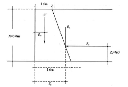 某一墙面直立,墙顶面与土堤顶面齐平的重力式挡墙高3.0m,顶宽1.0m,底宽1.6m,已知墙背主动土压力水平分力正Ex=175kN/m,竖向分力Ey=55kN/m,墙身自重W=180kN/m,挡土墙倾覆稳定性系数最接近()。