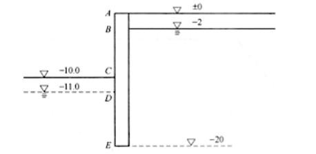 基坑剖面如图所示,已知土层天然重度为20kN/m3,有效内摩擦角Φ'=30°,有效黏聚力c'=0,若不计墙两侧水压力,按朗肯土压力理论分别计算支护结构底部正点内外两侧的被动土压力强度ep及主动土压力强度ea最接近()。(水的重度为γw=10kN/m3)