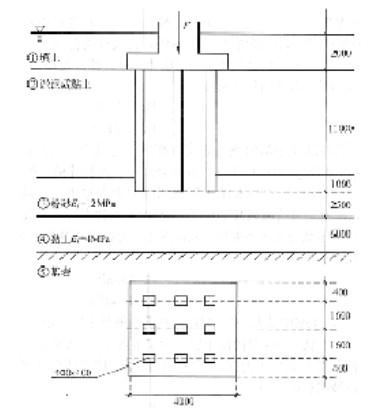 某群桩基础的平面、剖面如图所示,已知作用于桩端平面处长期效应组合的附加压力为300kPa,沉降计算经验系数Φ=0.7,其他系数见附表,按《建筑桩基技术规范》(JGJ94-94)估算群桩基础的沉降量,其值最接近()。 附表:桩端平面下平均附加应力系数。 A.2.5cm