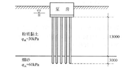 如图所示,某泵房按二级桩基考虑,为抗浮设置抗拔桩,上拔力设计值为600kN,桩型采用钻孔灌注桩,桩径d=550mm,桩长l=16m,桩群边缘尺寸为20m×10m,桩数为50根,按《建筑桩基技术规范》(JGJ94-94)计算群桩基础及基桩的抗拔承载力,下列()组与结果最接近。(桩侧阻抗力分项系数γs=1.65,抗拔系数λi:对黏性土取0.7,对砂土取0.6,桩身材料重度γ=25kN/m3;群桩基础平均重度γ=20kN/m3)
