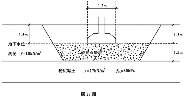 某钢筋混凝土条形基础埋深d=1.5m,基础宽b=1.2m,传至基础底面的竖向荷载Fk+Gk=180kN/m(荷载效应标准组合),土层分布如图所示,用砂夹石将地基中淤泥土全部换填,按《建筑地基处理技术规范》(JGJ79—2002)验算下卧层承载力,其结果为()。(垫层材料重度γ=19kN/m3)