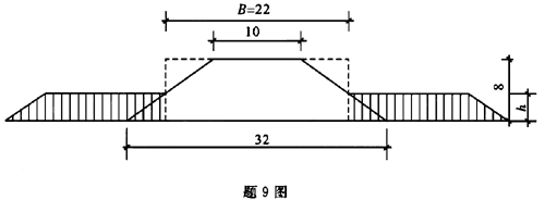 如图,某路堤高8m,路堤填土γ=18.8kN/m3,地基土γ=16.0kN/m3,φ=10°,c=8.7kPa。采用路堤两侧填土压重方法以提高地基承载力,则填土高度需()m才能满足(填土重度与路堤填土相同)。