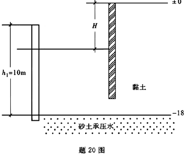 基坑剖面如图所示,已知黏土饱和重度γsat=20kN/m3,水的重度γw=10kN/m3,如果要求坑底抗突涌稳定安全系数K不小于1.2,承压水层侧压管中水头高度为10m,则该基坑在不采取降水措施的情况下,最大开挖深度最接近()。