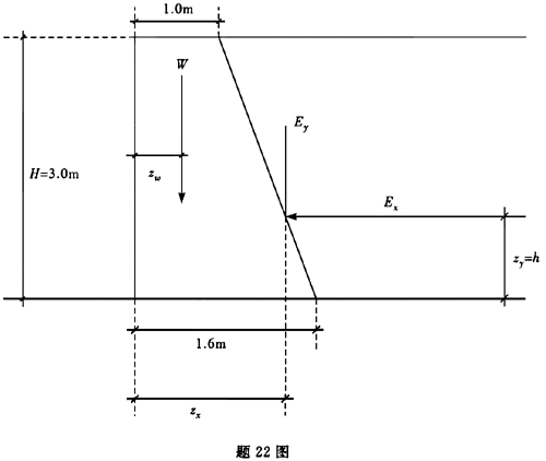 某一墙面直立、墙顶面与土堤顶面齐平的重力式挡土墙高3.0m,顶宽1.0m,底宽1.6m,如图所示。已知墙背主动土压力水平分力Ex=175kN/m,竖向分力Ey=55kN/m,墙身自重W=180kN/m,则挡土墙抗倾覆稳定性系数为()。