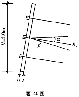 如图一锚杆挡土墙肋柱高H为5.0m,宽α为0.5m,厚b为0.2m,打三层锚杆,其锚杆支点处反力Rn均为150kN,锚杆对水平方向的倾角β均为10°,肋柱竖直倾角α为5°,肋柱重度γ为250N/m3。为简化计算,不考虑肋柱所受到的摩擦力和其他阻力,在这种假设前提下肋柱基底压应力σ估算结果为()。