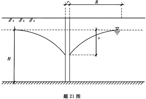 在水平均质具有潜水自由面的含水层中进行单孔抽水试验(如图所示),已知水井半径r=0.15m,影响半径R=60m,含水层厚度H=10m,水位降深s=3.0m,渗透系数K=25m/d,则流量最接近()。