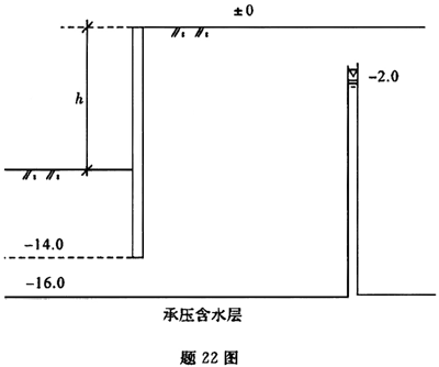 基坑坑底下有承压含水层,如图所示,已知不透水层土的天然重度γ=20kN/m3,水的重度γw=10kN/m3,如要求基坑底抗突涌稳定系数K不小于1.1,则基坑开挖深度h不得大于()。