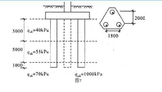 某承台下设三根钻孔灌注桩(干作业),桩径为600mm,桩长11m,各层土的厚度、侧阻、端阻如图7所示,则计算得基桩承载力特征值为( )kN。