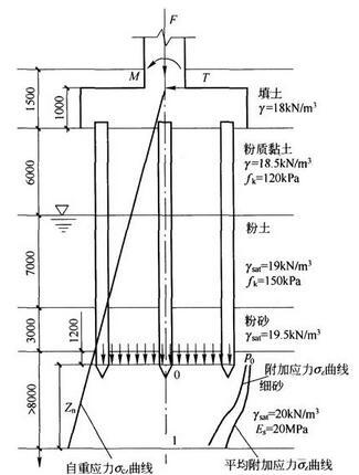 某一桩基传至柱底(标高-0.5m处)长期效应组合的荷载值为F=4000kN,M=1000kN·m,H=800kN,其他数根据如图3所示,建筑安全等级为二级,采用桩径为600mm的混凝土预制桩,试按《建筑桩基技术规范》(JGJ94—2008)规定的方法计算该桩基础的沉降量。桩基最终沉降量最接近于( )mm。