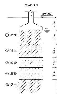 某一建筑物按抗震要求为乙类建筑,条形基础宽度b=2.0m,埋深d=2.0m,地基剖面如图5所示,基础底面下各层土的厚度、土性指标等如表2所示,荷载按地震效应组合计算,作用在基础顶面的竖向荷载标准值Fk=450kN。对液化土层进行砂石桩挤密处理,砂石桩直径400mm,正方形排列,要求将孔隙比从0.9降低到0.7,则砂石桩间距为( )m。