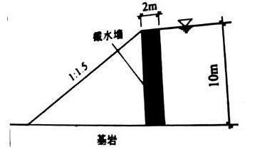 拟在砂卵石地基中开挖10m深的基坑,地下水与地面齐平,坑底为基岩,如图1所示。拟用旋喷法形成厚度2m的截水墙,在墙内放坡开挖基坑,坡度为1︰1.5,截水墙外侧砂卵石的饱和重度为19kN/m3,截水墙内侧砂卵石重度17kN/m3,内摩擦角φ=35°(水上下相同),截水墙水泥土重度为γ=20kN/m3,墙底及砂卵石土抗滑体与基岩的摩擦系数μ=0.4。试问该挡土体的抗滑稳定安全系数最接近于下列何项数值?( )