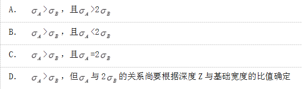 在相同的地基上,甲、乙两条形基础的埋深相等,基底附加压力相等、基础甲的宽度为基础乙的2倍。在基础中心以下相同深度Z(Z>0)处基础甲的附加应力σA与基础乙的附加应力σB相比( )。