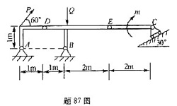 图示结构中,各构件的自重不计,已知:力偶矩的大小m=60kN·m,其转向为顺时针方向:Q=60kN,方向铅直向下; kN,方向如图示。支座A的反力沿水平和铅直方向的分力X A、YA的大小分别为()。 A.X A.=0,Y A.=0 B.X A.=30kN,Y A.=0 C.X A.=237kN,Y