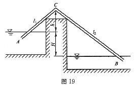 虹吸管将A池中的水输入B池,如图19所示。已知长度l1=3m,l2=5m,直径d=75mm,两池水面高差H=2m,最大超高h=1.8m,沿程阻力系数λ=0.02,局部阻力系数:进口ζa=0.5,转弯ζb=0.2,出口ζc=1,则流量Q及管道最大超高断面的真空度为()