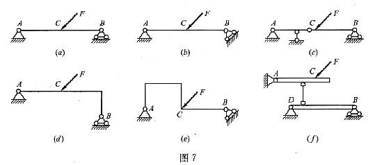 如图7所示各种情况下,力F的作用点为 C,力F与水平线的夹角都相等,各杆重量不计。设AC和BC的水平距离都相等,试指出哪些情况A处约束力相同。()
